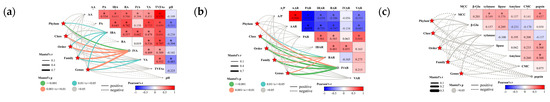 Correlations between rumen microbial and rumen fermentation parameters, as well as fermentation ratios of lambs, were evaluated, as shown in Figure 4. In general, the pH of lamb rumen was negatively correlated with the content of VFA and showed a significant negative correlation with PA, BA, and VA (Figure 4a). In addition, AA, PA, IBA, BA, IVA, and TVFAs exhibited significant positive correlations when compared with each other. Microbial communities significantly influenced the levels of IBA, IVA, and VA, with the strongest correlation observed with IVA (Figure 4a). Further analysis of the percentage of VFA revealed significant negative correlations between both AAR and A/P with PAR, IBAR, BAR, and VAR. However, AAR and A/P exhibited a significant positive correlation (Figure 4b). In addition, PAR, IBAR, BAR, IVAR, and VAR showed overall positive correlations with each other (Figure 4b). Meanwhile, microbial communities were able to significantly influence BAR and IVAR, with the strongest association found being with IVAR (Figure 4b). However, there was no significant correlation between microbial composition and rumen enzyme activities (Figure 4c). In addition, there was an overall positive correlation between rumen enzyme activities (Figure 4c).