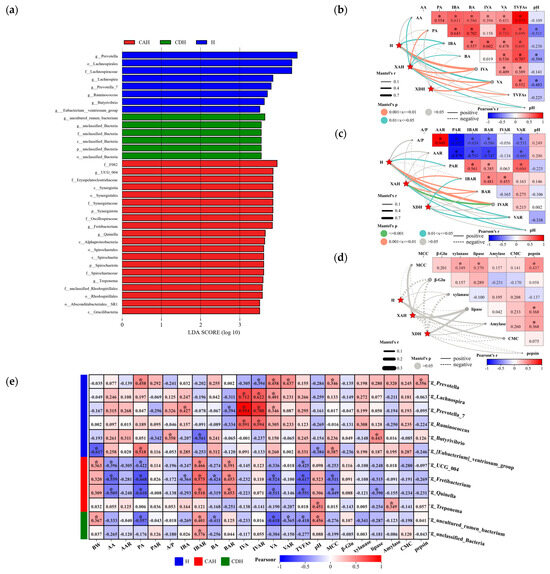 LEfSe was used to analyze biomarkers in the rumen of crossbred offspring lambs, with an LDA score of 3.5. The analysis revealed 34 statistically different biomarkers in the rumen fluid of lambs from various crossbreeding offspring, including 8 in H, 20 in CAH, and 6 in CDH. At the genus level, Hu sheep were included in Prevotella, Lachnospira, Prevotella_7, Ruminococcus, Butyrivibrio, and [Eubacterium]_ventriosum_group with six biomarkers. The four biomarkers in CAH sheep were UCG_004, Fretibacterium, Quinella, and Treponema. The two biomarkers in CDH were uncultured_rumen_bacterium and unclassified_Bacteria (Figure 5a). To gain more insight into the effects of biomarkers on rumen parameters, we correlated biomarkers obtained with rumen fermentation parameters (Figure 5b), molar proportion (Figure 5c), and rumen digestive enzyme activities (Figure 5d). Overall, biomarkers were able to influence rumen fermentation parameters (AA, PA, IBA, BA, IVA, VA, TVFAs, and pH) to varying degrees, but the association was stronger with IVA and VA (Figure 5b). In addition, it was also able to significantly influence VFA molar proportion (PAR, IBAR, BAR, IVAR, and VAR), with a more pronounced effect on IVAR (Figure 5c). In addition, we found no significant correlation between biomarkers for A/P and AAR (Figure 5c). Meanwhile, rumen pH showed a significant negative correlation with PA, BA, and VA (Figure 5b), but it was not significantly correlated with A/P, AAR, PAR, IBAR, BAR, IVAR, and VAR (Figure 5c). In addition, biomarkers were not significantly correlated with rumen enzyme activity (Figure 5d). Biomarkers overall were not significantly correlated with BW. BW was only negatively correlated with the [Eubacterium]_ventriosum_group, but it was significantly positively correlated with UCG_004 and uncultured_rumen_bacterium (Figure 5e). The combined analysis revealed significant correlations between biomarkers and rumen fermentation parameters. The analysis revealed that the correlations of the biomarkers with AA and VA and their molar proportion were similar. However, they differed significantly from PA, IBA, and BA correlations and their molar proportion. In addition, the correlation of the biomarker with TVFAs and its correlation with AA were similar, but the correlation with pH was significantly opposite (Figure 5e). Meanwhile, UCG_004, Fretibacterium, and Quinella were significantly positively correlated with IBAR and BAR, but they were significantly negatively correlated with AA, PA, and TVFAs, and Fretibacterium was negatively correlated with IBA, BA, and VA. Moreover, Butyrivibrio was significantly positively correlated with A/P and significantly negatively correlated with IBAR. In addition, Lachnospira, Prevotella_7, and Ruminococcus showed a significant positive correlation with IVA and IVAR. Prevotella showed a significant positive correlation with PA, VA, and VAR, but it showed significant negative correlation with IVAR. Prevotella_7 showed significant negative correlation with BAR, but it also showed significant positive correlation with IBA and VA. In addition, Lachnospira showed significant positive correlation with VA. In general, the biomarkers were largely not significantly correlated with rumen MCC, β–glucosidase, xylanase, lipase, amylase, CMC, and pepsin (Figure 5e). Our analysis revealed that MCC was significantly positively correlated with Prevotella, [Eubacterium]_ventriosum_group, but it was significantly negatively correlated with Fretibacterium and Quinella. In addition, lipase was significantly positively correlated with Butyrivibrio but significantly negatively correlated with Quinella. Meanwhile, amylase and pepsin were positively correlated with Treponema and Prevotella, respectively (Figure 5e).