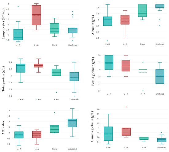 CBC parameters that differ in non-infected and double-coinfected dogs. L + R: L. infantum and R. ricketsii coinfection; L + A: L. infantum and A. phagocytophilum coinfection; R + A: R. ricketsii and A. phagocytophilum coinfection; and A/G ratio: albumin/globulin ratio. Data shown as mean ± SD.