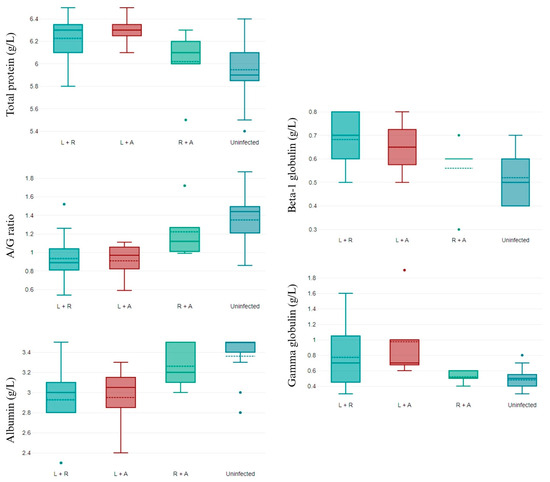 Several changes were observed in the biochemical parameters evaluated according to the coinfections found. Coinfections increased the total protein values, mainly when the coinfection was L. infantum/R. ricketsii. The albumin/globulin (A/G) ratio and beta-1 globulin decreased in all coinfections, and this effect was mainly observed with L. infantum presence. Similar results were observed for the albumin and gamma globulin values, which decreased in all coinfections, with lower albumin levels for L. infantum/R. ricketsii coinfection and gamma globulin levels for L. infantum/A. phagocytophilum coinfection (Figure 2).