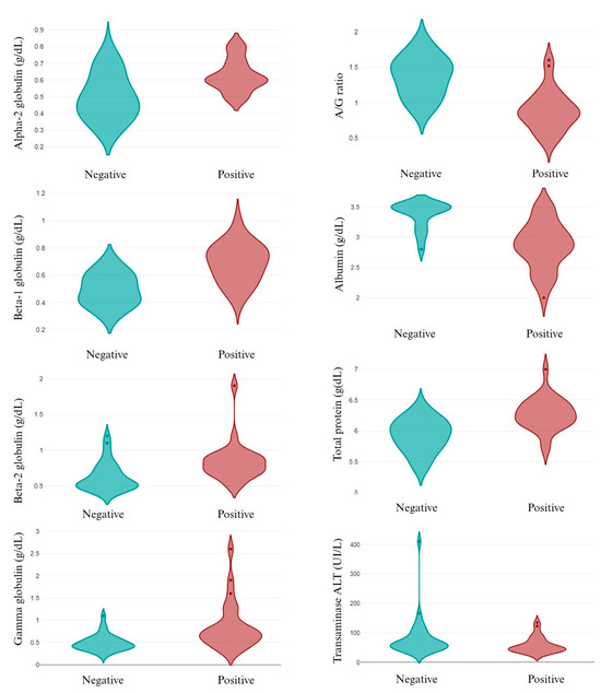 The complete blood count (CBC) includes red blood cells’ concentration (RBC), hemoglobin, hematocrit, mean corpuscular volume (MCV), mean corpuscular hemoglobin (MCH), mean corpuscular hemoglobin concentration (MCHC), white blood cells’ count (WBC), neutrophils, lymphocytes, monocytes, eosinophils, and platelets. The biochemistry profile includes glucose, creatinine, urea, total cholesterol, aspartate aminotransferase (AST), alanine aminotransferase (ALT), total protein, albumin/globulin (A/G) ratio, albumin, and alpha-1, alpha-2, beta-1, and beta-2 globulins. The biochemical and hematological parameters were considered altered when they were outside the reference intervals, and the serum protein electrophoretic patterns were defined in accordance with the published guidelines [27].