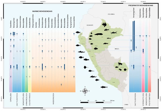 According to Luque et al. [9], monogeneans represent the most species-rich group of platyhelminthes in Peru. Research on monogeneans from Peru dates back to the early 1970s [10]. The first monogenean species formally described in Peru was Pseudoeurysorchis sarmientoi Tantaleán, 1974. This diclidophorid species infects the gill filaments of Seriolella violacea [10,11]. Following that, Tantaleán [12,13] described Cynoscionicola sciaenae Tantaleán, 1974, Choricotyle chimbotensis Tantaleán, 1974, and C. peruensis Tantaleán, 1974. Numerous efforts have been undertaken in the past to assess the diversity of these flatworms as parasites in aquatic vertebrates from Peru [14,15,16]. While all of these checklists incorporate findings presented at scientific meetings, it is essential to note that any new records must fulfill specific criteria: they must be supported by deposited specimens in a scientific collection and undergo publication in a scientific journal. In a study conducted less than a decade ago, Luque et al. [9] compiled a comprehensive list of fish monogeneans, identifying a total of 175 species from Peru. Nonetheless, a detailed review of the Luque et al. [9] checklist revealed some discrepancies (i.e., mistaken records, lack of nomenclature updating, etc.).