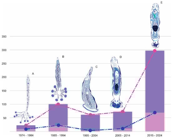 - Kmentová, N.; Cruz-Laufer, A.J.; Pariselle, A.; Smeets, K.; Artois, T.; Vanhove, M.P. Dactylogyridae 2022: A meta-analysis of phylogenetic studies and generic diagnoses of parasitic flatworms using published genetic and morphological data. Int. J. Parasitol. 2022, 52, 427–457. [Google Scholar] [CrossRef] [PubMed]
