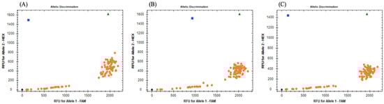 SNP genotyping assays were performed using 0.25 μL of rhAmp SNP Assays (20X), 2.65 μL of combined rhAmp Genotyping Master Mix (2X) and rhAmp Reporter Mix (40X), 0.10 μL of nuclease-free water and 2 μL of sample DNA, and 2 μL of control template (gBlocks fragments controls) or 2 μL of nuclease-free water (for no-template control reactions). Reactions were run on the CFX Connect Real-Time PCR Detection System (Bio-Rad Laboratories, Hercules, CA, USA), and analyses were carried out using CFX Maestro Software version 2.3 (Bio-Rad, Hercules, CA, USA). The thermal conditions were 95 °C for 10 min, followed by 40 cycles at 95 °C for 10 s, 60 °C for 30 s, and 68 °C for 20 s per the published protocol (www.idtdna.com/rhAmp-SNP-protocol (accessed on 29 February 2024).