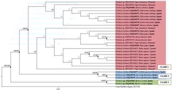 Phylogenetic analysis revealed a sister relationship between clade 1, which included T. trichiura and Trichuris sp. isolated from humans and non-human primates, and clade 2, which comprised T. suis and T. colobae (100 BPP and 69% ML BV). Likewise, both clades remained separate from Trichuris sp. from porcupine (Figure 2).