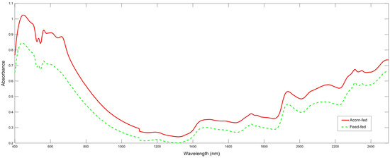 In accordance with the findings highlighted by the PCA analysis (Figure 2), misclassified samples by regressions were concentrated in AF category. These samples were investigated and corresponded to those above-mentioned that, in Figure 2, overlapped with samples from OFF category. This fact is probably associated to the referred heterogeneity of AF feeding regime and the great deal of natural resources that pigs graze in the dehesa [2]. In this regard, although grass and acorns are predominant, previous studies have found the inclusion of up to 15 natural resources, depending on the individual, in the diet of AF Iberian pigs in the dehesa [2]. This could explain the heterogeneous spectral information obtained for the AF category, further complicating the model’s performance in comparison with FF feeding regime, where a higher homogeneity of diets is obtained because of the exclusive use of feed. The classification error and the overlapping between the AF and OFF categories have also been noticed in a similar study which employed faecal samples and chromatographic analysis to discriminate the Iberian pig diet [6]. Misclassified samples could also be related to the genetic variability of the animals included in the study, which has been suggested before as an influential factor, together with feeding system and individual variability, for the authentication of Iberian pig commercial categories using NIRS technology [15]. The present findings and the misclassification of samples from the AF group inside the FF group could also be related to the possible inclusion of feed in the feeding regime of the AF pigs [5]. Nowadays, there is some controversy over this inadequate strategy because, although it facilitates pigs’ handling, it is not established in regulation and final products are commercialised as acorn products without mentioning this information. What is more, it has not been deeply studied in the literature [6,21], so further studies would be welcomed in the future.