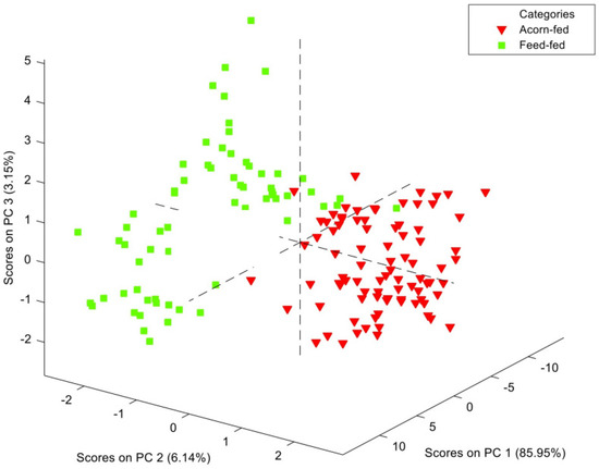 The comparison used in the present study between AF and FF Iberian pigs has often been evaluated in the literature using other analytical techniques for preliminary evaluations and authentication purposes of the feeding regime of this breed [6,33,34,35]. In fact, this simplification of the current categorisation to only two groups has even been suggested by some authors as an option to clarify the market [36], since the current labelling may be confusing for customers [37,38]. In this regard, the results here presented would contribute to cover society’s increasing demand of valuable information about food authenticity and production systems [39], as the methodology used could support certification work in Iberian pig production and therefore in final products.