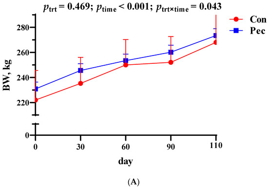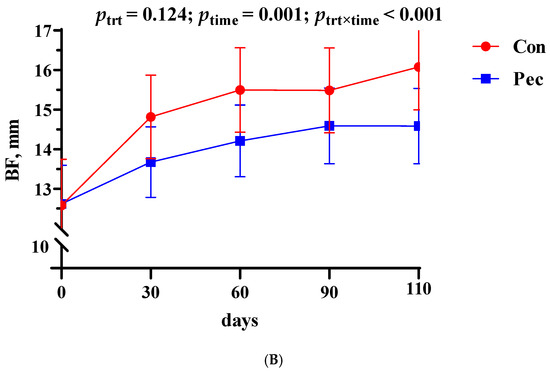 Effects in Pec and Con groups during gestation. (A) Body weight (BW) and (B) backfat (BF) thickness changes during gestation. Pec, pectin diet during gestation; Con, control diet during gestation. Data are expressed as least squares mean ± SE. Sows were regarded as experimental units, (A,B): Pec, n =15; Con, n = 15.