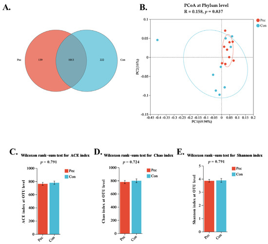Effects in Pec and Con sows on day 110 of gestation on the gut microbiota structure of the sows. (A) Veen diagram of the sow fecal microbiota comparing Pec and Con sows at the OTU level; (B) principal coordinate analysis of the gut microbiota communities of Pec and Con sows at the phylum level; (C) ACE; (D) Chao, and (E) Shannon indexes of the gut microbiota on day 110 of gestation. Pec, pectin, n = 9; Con, control, n = 9.