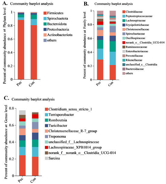 The relative abundance of the gut microbiota at different levels in Pec and Con sows on day 110 of gestation. (A) Phylum level; (B) family level; (C) genus level. Pec, pectin, n = 9; Con, control, n = 9.