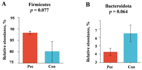 Effects in Pec and Con sows on the gut microbiota at the phylum level on day 110 of gestation. (A) Firmicutes; (B) Bacteroidota. Pec, pectin, n = 9; Con, control, n = 9.