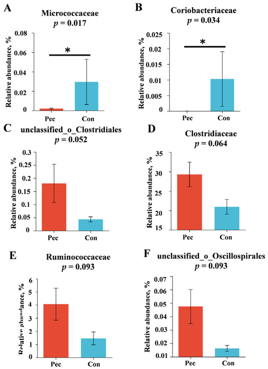 Effects in Pec and Con sows on the gut microbiota at the family level on day 110 of gestation. (A) Micrococcaceae; (B) Coriobacteriaceae; (C) unclassified_o_Clostridiales; (D) Clostridiaceae; (E) Ruminococcaceae; (F) unclassified_o_Oscillispirales. Pec, pectin, n = 9; Con, control, n = 9. * indicates p < 0.05.