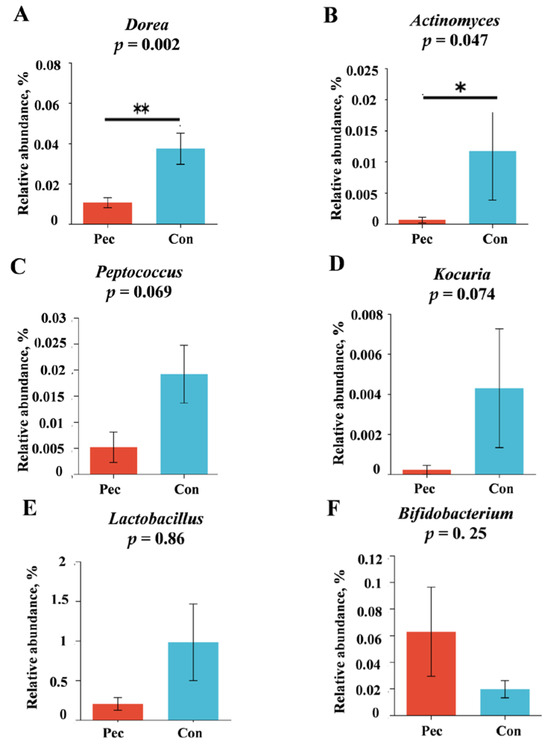 Effects in Pec and Con sows on the gut microbiota at the genus level on day 110 of gestation. (A) Dorea; (B) Actinomyces; (C) Peptococcus; (D) Kocuria; (E) Lactobacillus; (F) Bifidobacterium. Pec, pectin, n = 9; Con, control, n = 9. * indicates p < 0.05, ** indicates p < 0.01.