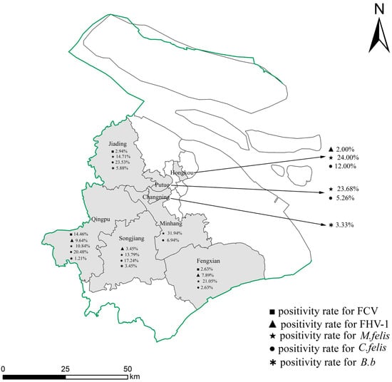 Geographical distribution of the eight districts with respiratory pathogens positivity rates in Shanghai. A total of 374 samples collected from eight districts in Shanghai were examined for the presence of IV-A, FCV, FHV-1, M. felis, C. felis, and B.b. Each symbol represents a pathogen, and the percentages provided indicate the proportion of positive samples for the specified pathogens in each district. The scale in the bottom-left corner represents the theoretical distances on the map.