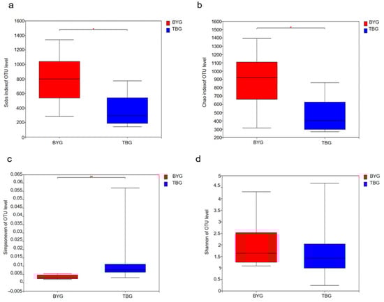 The alpha diversity between the BYG group and TBG group: (a) Sobs diversity index of OTU level, (b) Chao1 index of OTU level, (c) Simpsoneven index of OTU level, and (d) Shannon index of OTU level. p values were calculated using Wilcoxon rank-sum tests. * p < 0.05, ** p < 0.01.
