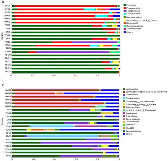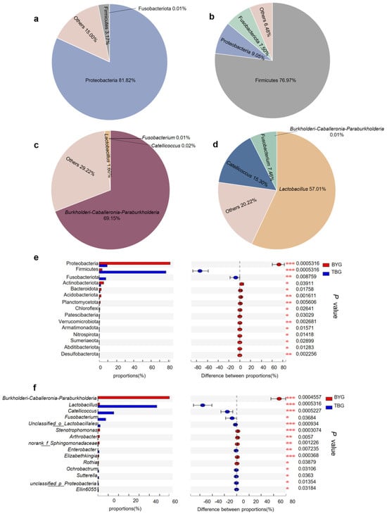 The OTUs were classified into 38 phyla, 104 classes, 245 orders, 405 families, and 776 genera in total. The gut microbiota of the captive gray cranes in the BYG group was presented by 37 bacterial phyla and 663 microbial genera, while there were 29 bacterial phyla and 594 microbial genera in the wild gray cranes in the TBG group. The bacterial read profiling of 16S rRNA sequencing at phylum level (Figure 2a) and genus level (Figure 2b) of each sample from two groups were analyzed in this study. The dominant phyla of the BYG group were Proteobacteria (81.82%), Actinobacteria (4.94%), and Firmicutes (3.17%). However, Firmicutes (76.97%), Proteobacteria (9.05%), Fusobacteria (7.50%), and Actinobacteria (1.52%) were the dominant phyla in TBG group (Figure 3a,b). The high-throughput sequencing approach identified Firmicutes, Actinobacteria, and Proteobacteria, as the most abundant phyla in all the fecal samples from G. grus, although the proportion of Proteobacteria and Firmicutes differed substantially. At the genus level, the most abundant genera in BYG group were Burkholderia–Caballeronia–Paraburkholderia (69.15%) and Lactobacillus (10.06%). Compared with the BYG group, the samples in TBG group were more enriched in Lactobacillus (57.01%) and Catellicoccus (10.06%) (Figure 3c,d). Further comparisons of microbial composition between the two groups were performed at the family level and class level based on 16S sequencing results (Supplemental Figures S3 and S4).