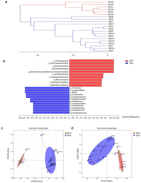 The Wilcoxon rank-sum analysis showed significant differences in many of the phyla, mainly in the Proteobacteria (p = 0.0005) and Firmicutes (p = 0.0005). At the genus level, significant decreases were seen in Burkholderia–Caballeronia–Paraburkholderia (p = 0.0004) in the TBG group. Lactobacillus and Catellicoccus in the TBG group displayed opposite results compared to samples from the BYG group, suggesting that they might be tightly linked to the external environment and dietary habits (Figure 3e,f). Hierarchical clustering analysis of the gut microbiotas in all fecal samples at the genus level using Bray–Curtis showed that the two different groups formed distinct clusters, indicating that there were clear differences between the two groups (Figure 4a). Next, linear discriminant analysis (LDA) and effect size (LEfSe) were used to detect the differences in relative abundance in the bacterial taxon. The data revealed that the differences were most significant from phyla to genus levels (Figure 4b). Results from the LEfSe analysis determined that Firmicutes, which make up >55% of gut microbiome communities in G. grus, had higher relative abundances in the TBG group, while Proteobacteria (composed >29% of gut microbiome communities) were more abundant in the BYG group (p < 0.05 for all). LEfSe analyses identified 22 bacterial taxa that explained these differences, including 10 and 12 taxa (LDA = 4.0) with discrepancies in relative abundance in the BYG group and TBG group, respectively.