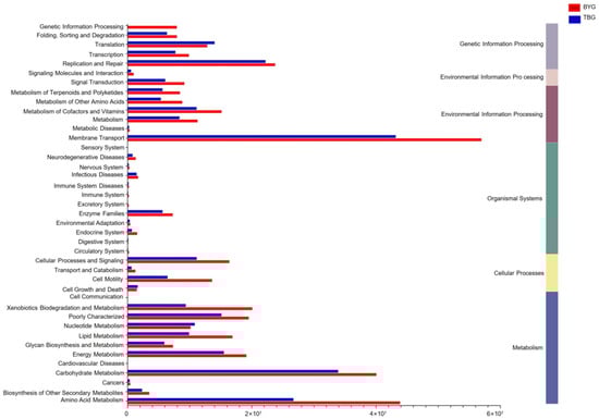 At pathway level 1, all six categories of functional information including metabolism, organismal systems, and environmental information processing were analyzed and the differences in the abundances of genes related to various COG (level 2) and KEGG (level 2) categories between the two groups were investigated. At pathway level 2, membrane transport, and replication and repair were the main functions of the gut microbiome. The super pathway of heme biosynthesis from glutamate, aerobic respiration I (cytochrome c), and L−leucine degradation I of BYG group was significantly higher than the TBG group (p < 0.0001).