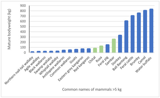 Mean mature bodyweights of native and introduced mammals > 5 kg found in northern tropical Australia; deer species shown in green [32].