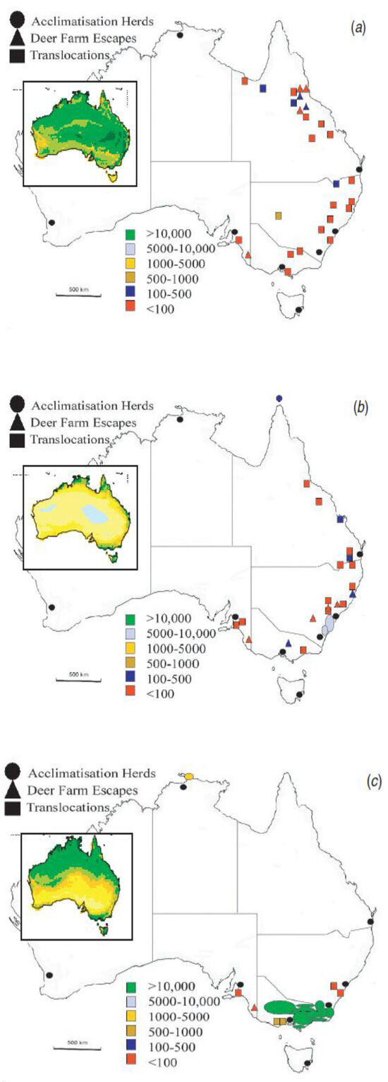 Distribution and abundance of (a) chital, (b) rusa and (c) sambar deer in Australia in 2000 (herd data points not to scale). Insets show the bioclimatic (predicted) distribution of chital, rusa and sambar, respectively (M Bomford, unpublished data). The scale of predicted habitat suitability ranges from pink and dark green, indicating high habitat suitability, to light green and orange, indicating medium habitat suitability, and then to yellow and blue, indicating poor habitat suitability. Taken from Moriarty [34].