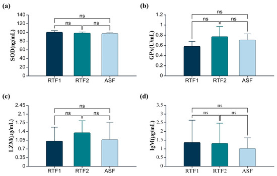 The expression levels of immune-related protein genes (sod1l, sod1, sod2, gpx2, gpx1a, gpx4a, lyz, lyg, lygl, cbr1 and alox5a) were confirmed. There were no significant differences in their expression levels, including SOD, GPx and LZM-related genes, between the RTF1 and ASF groups. This is similar to the results from the plasma analysis, showing that the low-lipid feed did not change the intestinal immune enzymes.