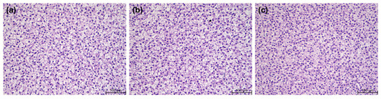 The intestine and liver tissues were fixed in a 10% formalin solution for a week and then immersed in 95% and 99.9% ethanol for 1 h each. The samples were then transferred to xylene, which was used twice for 1 h each and once for 75 min. The samples were then embedded in paraffin wax. After the paraffin block was produced, it was sectioned to a thickness of 4 μm and attached to a slide. To remove paraffin from the slides, xylene was applied for 2 min each. Afterwards, xylene was removed using 99.9% ethanol for 2 min each, as well as 95% and 70% ethanol for 30 s each. Before staining, the sections were washed for 30 s and stained with haematoxylin staining reagent for 5 min. After they were washed with water for 30 s, the sections were washed in 0.3% HCl alcohol for 3 s and then stained with eosin Y for 1 min and 30 s. Dehydration was performed using 70%, 95% and 99.9% ethanol for 30 s. Transparency was assessed using xylene for 6 min, after which samples were mounted on Canada balsam. Slices of intestinal and liver tissues were prepared and placed on a microscope slide. The tissues were photographed at 200× magnification using THUNDER Imager 3D Tissue (Leica Microsystems, Wetzlar, Germany).
