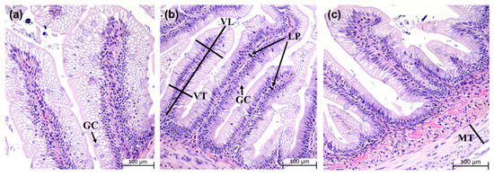 66]. In this study, the pathological symptoms of lipid accumulation and inflammation in hepatocytes were not observed in any of the experimental groups. There were no significant differences between groups in terms of liver cell density or cell nuclear location. The intestinal mucosal epithelium is both nutritionally and immunologically important [