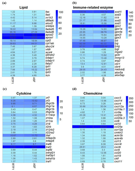 34]. Expressed genes linked to lipid metabolism, immune-related enzymes, cytokines and chemokines were selected to compare the expression levels between the RTF1 and ASF groups.