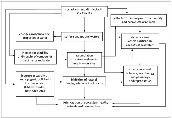 Scheme of the possible pathways of entry of surfactants and disinfectants into the environment and their impact on living organisms.