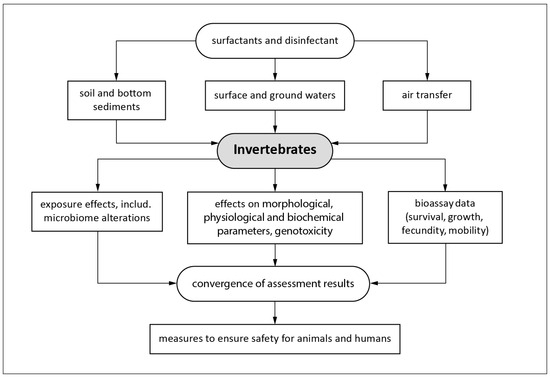 Summarizing, the accumulation of detergents, sanitizers, or their metabolites together with other environmental pollutants in the aquatic environment can disrupt the environmental safety/welfare of terrestrial and aquatic biota. Representatives of invertebrates play a key role in different ecosystems as environmental engineers (bioconstructors) [78]. In the presence of detergents that significantly change the pH of the environment, these animals may experience disturbances in the functioning of mucous structures and, consequently, excretory functions (for example, the production of secretions and feces). This disrupts building their tube-dwellings and producing similar materials for other animals in their common ecosystem [78]. Therefore, further research is needed on the effects of detergents and disinfectants on the essential functional systems of invertebrates.