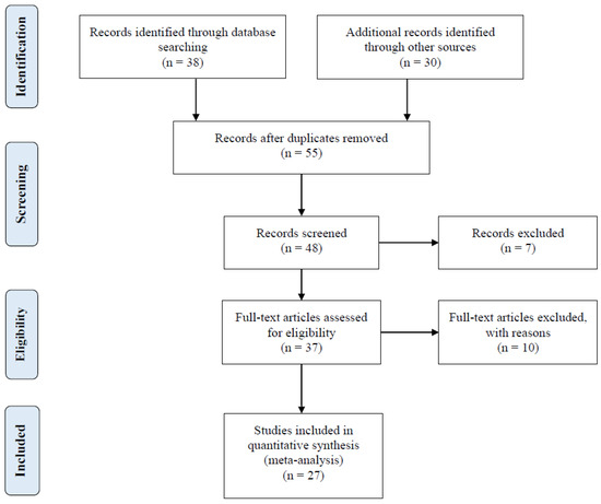 A digital search was conducted through bibliographic databases (Google Scholar, Scopus, PubMed, CAB Direct, Web of Science, and Mendeley) to retrieve peer-reviewed articles evaluating the effect of a commercial MRF product (Actigen®, Alltech Inc., Nicholasville, KY. USA) on broiler performance. The digital search strategy was based on the inclusion of the following keywords: “broilers”, “poultry”, “mannan oligosaccharide”, “mannan-rich fraction”, “Actigen”, “growth performance”, and “broiler performance”. The literature search was conducted in 2023, and there was no prior date restriction imposed on the literature search to cover the entire duration that the MRF product had been investigated in broilers. Additionally, the company’s internal bibliographic database was searched to retrieve unpublished trial reports presented in a PhD dissertation or international scientific conferences. Figure 1 shows the schematics of the literature search and article selection applied in this meta-analysis according to the Preferred Reporting Items for Systematic Reviews and Meta-Analyses (PRISMA) Statement [36,37,38].
