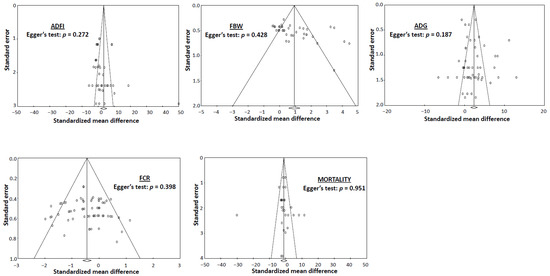 Funnel plots and the significance (p-value) of the Egger’s test in assessing the publication bias of the dataset analyzed for average daily feed intake (ADFI), final body weight (FBW), average daily gain (ADG), feed conversion ratio (FCR), and mortality. Open circles indicate individual study comparisons included in the meta-analysis.