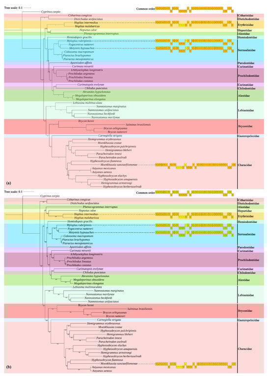 - Meng, F.; Huang, Y.; Liu, B.; Zhu, K.; Zhang, J.; Jing, F.; Xia, L.; Liu, Y. The complete mitochondrial genome of Lebiasina astrigata (Characiformes: Lebiasinida) and phylogenetic studies of Characiformes. Mitochondrial DNA Part B 2019, 4, 579–580. [Google Scholar] [CrossRef]