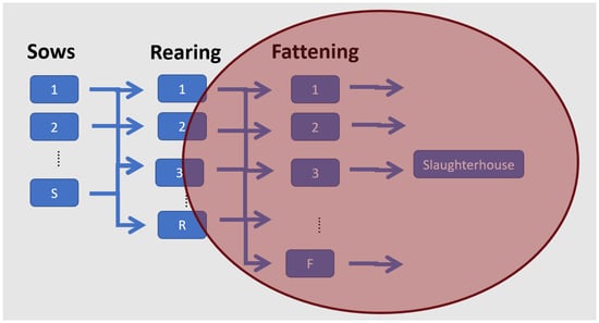 The problem addressed in this paper is based on a real-life scenario encountered by PSC managers, who must coordinate the transportation of fattened pigs from various fattening farms to the abattoir (Figure 1). This scenario is a usual one in vertically integrated companies or cooperatives globally [3], including the Spanish pig sector [6]. Each week, the abattoir needs to organize trips to collect the marketable pigs from different fattening farms owned by the integrator. Pig farming encompasses various types of essential farms, as illustrated in Figure 1: sow farms, rearing farms, and growing–fattening farms. However, different combinations of sow-rearing farms, rearing–fattening farms, or farrowing-to-finish farms may coexist under the same integrator. The number of marketable pigs in each fattening farm is estimated by a farm visitor, an individual assisting the PSC manager who estimates pig live weights visually [10]. These estimations are utilized to determine the tentative date for commencing pig deliveries to the abattoir and clearing the farm. Fattening farms adhere to an all-in-all-out (AIAO) management policy, meaning that all pigs enter the farm as a batch, and a new batch can only be introduced once all the pigs from the previous batch have been delivered to the abattoir and the facilities have been cleaned.