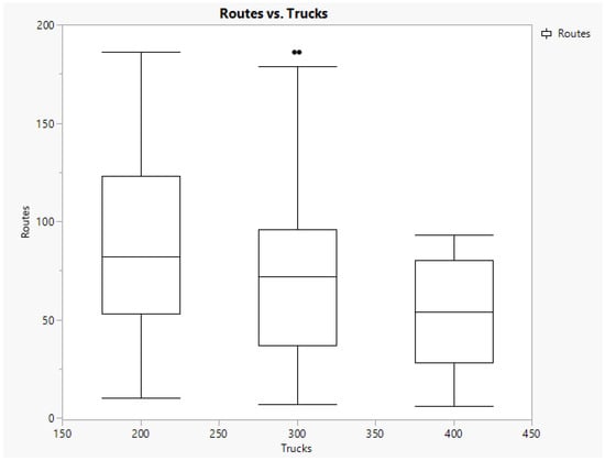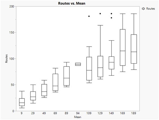 We considered different load capacities for trucks to explore their effect on the number of routes to be implemented. This information is shown in Figure 4. As expected, higher load capacity implies fewer routes to cover and less variability. Figure 4 demonstrates a clear decrement in the average number of routes when truck capacity is increased. This effect may imply an interesting reduction in greenhouse gas emissions.