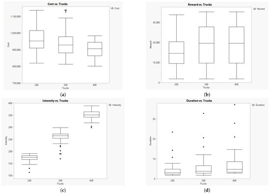 Other outputs are also affected by the load capacity of trucks (see Figure 5). For instance, cost is reduced when capacity is higher (Figure 5a), while the impact on reward is more limited (Figure 5b). This might be due to the fact that the total capacity of the fleet surpasses the number of pigs in farms to collect. Accordingly, the intensity of completing truck capacity increases with truck capacity (Figure 5c). At the same time, trip times represented by duration increase slightly because more truck capacity allows the company to plan longer routes (Figure 5d), thus implying less cost per truck and more reward capacity.