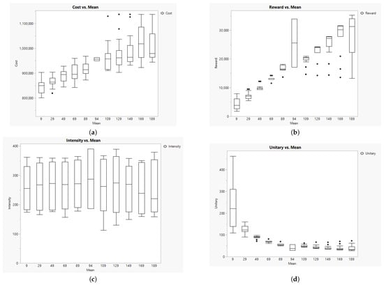 The number of pigs to be delivered to the abattoir is a crucial element in solving the TOP. A low mean number of pigs available for slaughtering may imply longer routes to fulfill the truck capacity, while more pigs may limit the flexibility to complete the truck load. Figure 6 summarizes the impact of different average numbers of pigs per farm available to be sent to the abattoir. Figure 6a represents the increasing cost when the average number of animals increases. Logically, if there are more pigs in the system, then more trips are required to the abattoir. This is confirmed with Figure 6b, showing that the number of pigs generating rewards depends on the mean value considered.