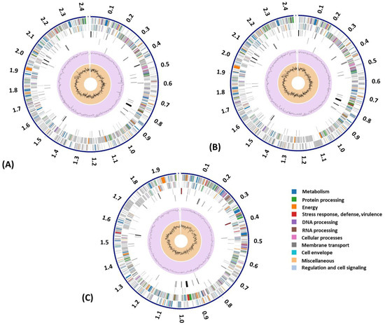 The number of Enzyme Commission (EC) [31] and Gene Ontology (GO) [32] assignments for each bacterial genome, including the number of proteins with pathway assignments based on mapping to the Kyoto Encyclopedia of Genes and Genomes (KEGG) pathways database [33], are described in Table 1. More hypothetical proteins were identified in the genomes of the Han-Large and Stan-Large isolates than in the genome of the Stan-Small isolate. An overview of the analysis of the subsystems for the genome of each bacterial isolate is shown in Figure 2A–C. Most of the proteins are identified to be involved in cellular metabolism followed by protein processing, energy generation, stress response, defense, virulence, DNA processing, RNA processing, and other miscellaneous proteins (Figure 2). The alignment of the second contig of the three isolates showed 100% nucleotide identity. The NCBI Nucleotide BLAST of the contig revealed a sequence identity of 99.83% with pECQ4552_IHU08 plasmid DNA identified in the Escherichia coli strain Q4552 (GenBank accession# CP077071.1). The identified plasmid DNA contains genes that express phage holin/antiholin component S and phage endopeptidase Rz proteins, among other hypothetical proteins.