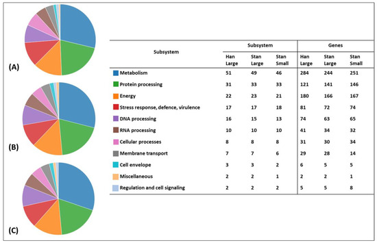 An overview of the subsystems for the genomes of the Han-Large (A), Stan-Large (B), and Stan-Small (C) isolates of A. hippocoleae.