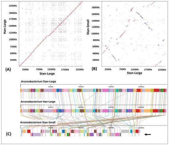 Dot-Plot analysis of the genomes of the Han-Large and Stan-Large isolates (A) and the Stan-Large and Stan-Small (B) isolates of A. hippocoleae. (C) Comparison of the genomic organization of the genomes of the Han-Large, Stan-Large, and Stan-Small isolates of A. hippocoleae by progressiveMauve alignment. Linear collinear blocks (LCB)s are shown by different colors. LCBs indicated by the arrow have an inverted orientation in the genome of the Stan-Small isolate.
