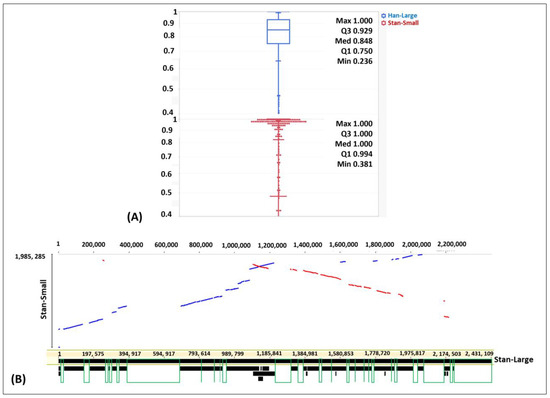 A continuous match was observed when the genomes of the Stan-Large and Han-Large genomes were compared by a Dot-Plot analysis (Figure 3A). In contrast, deletions and inversions were observed when the genomes of the large phenotypes were compared with the Stan-Small genome (Figure 3B). Furthermore, progressiveMauve-based genome alignment was performed to determine the collinearity of the Stan-Large, Han-Large, and Stan-Small genomes. As indicated in Figure 3C, 101 linear collinear blocks (LCBs) were identified with genome rearrangements, inversions, and gene losses observed in the Stan-Small genome.
