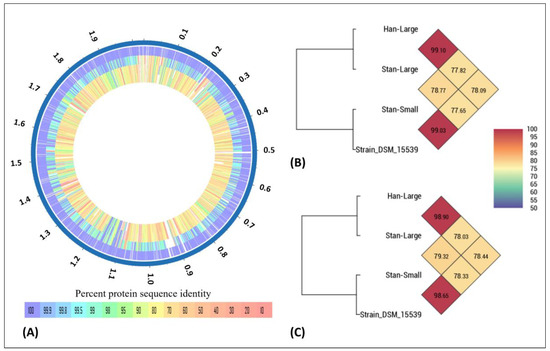 Each genomic DNA was annotated using RASTtk in PATRIC. The number of identified protein-coding sequences, repeat regions, transfer RNA (tRNA), and ribosomal RNA (rRNA) genes for the genome of each bacterial isolate is summarized in Table 1. A circa plot displaying annotations of the Han-Large (Figure 1A), Stan-Large (Figure 1B), and Stan-Small (Figure 1C) genomes is shown. The number of proteins with functional assignments was 1435, 1327, and 1273 for the Han-Large, Stan-Large, and Stan-Small isolates, respectively.