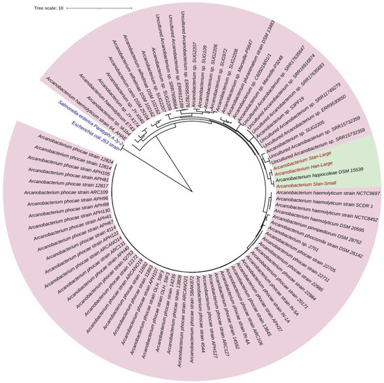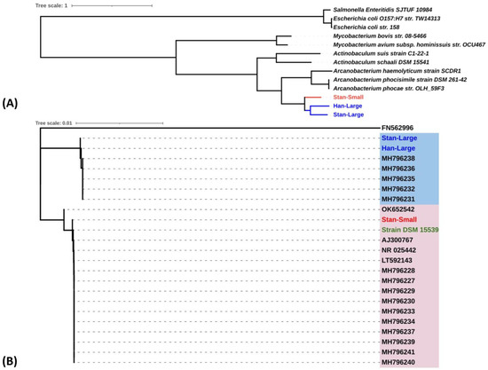 Phylogenetic tree analysis based on the concatenated sequences of twenty protein-coding regions (Table 2) with the highest alignment score of our three isolates, including ten other bacterial species retrieved from GenBank, indicated that the Stan-Large and Han-Large isolates clustered together, while the Stan-small isolate clustered in a different group (Figure 6A). Similarly, phylogenetic analysis based on the 16S rRNA gene sequences of our isolates together with the 16S rRNA gene sequences of twenty A. hippocoleae retrieved from GenBank showed that the A. hippocoleae sequences clustered into two different genotypic groups, and the Stan-Large and Han-Large isolates clustered in the same group with a 99.94% sequence identity, while Stan-Small and A. hippocoleae strain DSM 15539 clustered together in a separate group with a 100% sequence identity (Figure 6B). The 16S rRNA gene sequence identity between Stan-Large and Han-Large with A. hippocoleae strain DSM 15539 were 99.02 and 98.95%, respectively. In addition, the whole genome-based phylogenetic tree construction of eighty-two isolates of different Arcanobacterium species together with the sequences of our isolates revealed that Stan-Large and Stan-Small subclustered together, while Stan-Small and A. hippocoleae strain DSM 15539 grouped together in a separate subcluster. However, all three isolates were evolutionarily closely related to A. hippocoleae strain DSM 15539 compared to the other Arcanobacterium species (Figure 7).