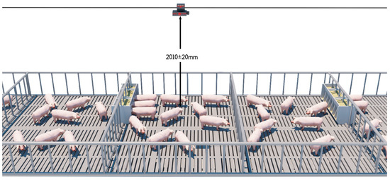 In this study, the AIWS uses an Intel RealSense D430 deep camera to collect 3D pig image data based on machine deep learning and the BotNet regression network to predict pig weight [13]. The input image resolution for the algorithm is 640 × 480, and the format is a 16-bit single channel. In the image, the value of each pixel represents the distance from that point to the camera. The image is captured using a depth camera and is processed through methods such as spatial three-dimensional point cloud denoising and filling before being converted into a two-dimensional format. This equipment consists of four main parts: a cloud service system, an artificial intelligence computing system, a data collection terminal, and an application side. The cloud service system is an essential part of the AIWS. Its main functions include setting up patrol robot running programs, monitoring patrol robot operation status, storing image and video data, etc. The artificial intelligence computing system is the core part of the AIWS and consists of pre-procession of the front and cloud platforms. The raw depth images are preprocessed by a series of preprocessing algorithms which include instance segmentation, distance independence, noise reduction, and rotation correction. Then, processed images are input into the algorithm model to predict the weight of the pig. A data collection terminal (depth camera), also called the patrol robot, is installed on an “I”-shaped track above the pig herd and 2010 ± 20 mm above the ground. It collects the back-depth images of free-moving pigs in the top-view automatically and moves them back and forth on the track (Figure 1). The system uploads the depth image data to the artificial intelligence computing system through the wireless network and estimates the weight of every pig. Then, the average weight per pen is calculated. Finally, the weight data are output to the mobile phone or computer application through the Internet for querying.