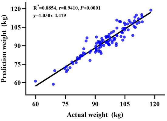 The results of the correlation analysis of the two weight measurement methods are provided in Figure 2. The correlation coefficient of the two weight measurement methods for 60 to 120 kg growing-finishing pigs was r = 0.9410, and the determination coefficient was R2 = 0.8854. An extremely significant correlation (p < 0.001) was observed between the two weighing methods.