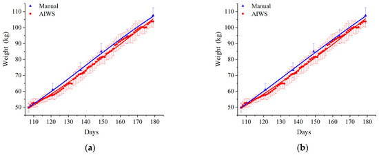 A total of 360 growing-finishing pigs (Duroc × Landrace × Large White) with an average initial body weight of 49.72 ± 3.00 kg were randomly divided into six replicates with 60 pigs per replicate. All the trial pigs were manually weighed using a traditional weighbridge at the beginning of the experiment; subsequently, all pigs were weighed every two weeks. Body weights were recorded after every measurement. At the same time, the AIWS predicted weight of each replicate was recorded daily until the end of the experiment.
