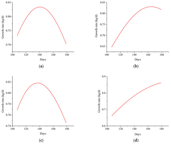 The absolute growth rate curve of the first derivative. (a) Growth rate of Logistic model in manual weighing, (b) Growth rate of Logistic model in AIWS weighing, (c) Growth rate of Gompertz model in manual weighing, (d) Growth rate of Gompertz model in AIWS weighing.