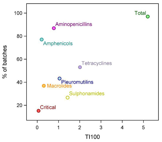 During the six months before slaughtering, antimicrobials were administered in almost all farms (97.0%) of origin of the batches (median AMU = 5.2 TI100) (Table 3, Figure 1). Critical antimicrobials were administered in 15.2% of the farms, but in low quantities (median = 0.06 TI100). Among the classes administered to treat respiratory infections (Table 2), the two most frequently used were aminopenicillins and amphenicols, while sulfonamides and macrolides were less frequently administered, although the former were used sometimes in large quantities (up to 25.3 TI100).