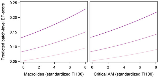 The proportional EP score was not related to the total AMU and did not vary among the years, but it increased significantly, albeit slightly, with the increasing farm size (coefficient estimate ± ES: 0.16 ± 0.04; p < 0.0001). Among the antimicrobial classes, significant, positive associations of the EP scores with the past use of critical antimicrobials (0.07 ± 0.03; p = 0.041) and macrolides (0.08 ± 0.04; p = 0.044) were detected (Figure 2). The proportional SPES score was not related to any of the examined variables (all p > 0.05).