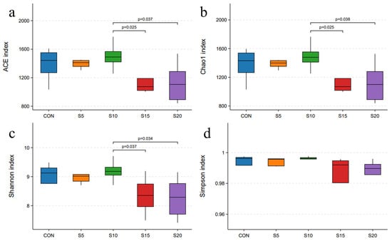 With respect to microflora changes, the alpha diversity analysis, beta diversity analysis, and rumen microorganism composition changes were presented in Figure 1, Figure 2, Figure 3 and Figure 4. S15 and S20 of the basal diet with hydroponic wheat sprouts resulted in a decrease in the richness indexes of ACE (Figure 1a) and Chao 1 index (Figure 1b), and also diversity index of Shannon index (Figure 1c). No significant difference was observed in the Simpson index (Figure 1d).